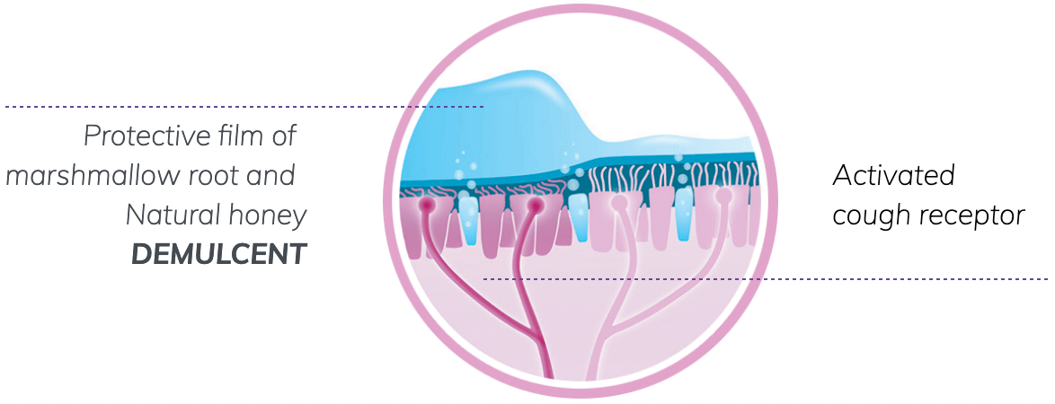 The valuable main ingredients of marshmallow and honey act like a balm, covering and thereby soothing the inflamed pharyngeal mucosa. The mucilage forms a physical protective coating against foreign particles thus relieving dry, irritating cough and allowing the mucosa to recover.